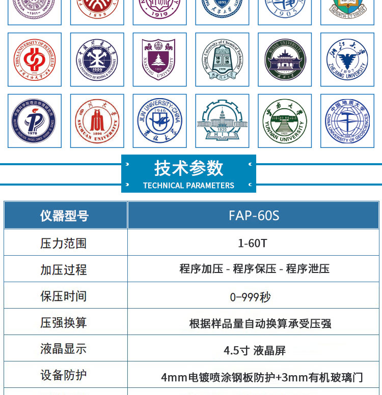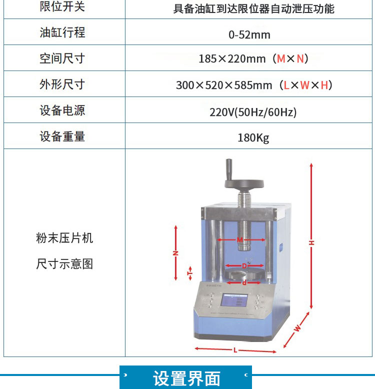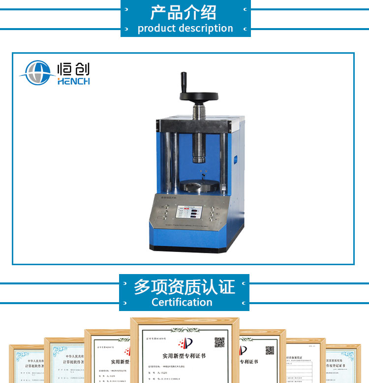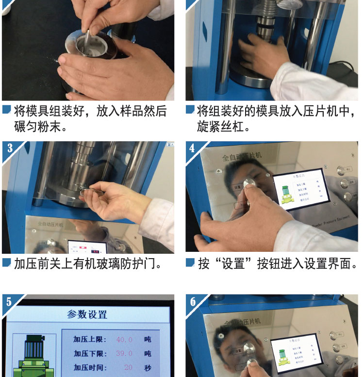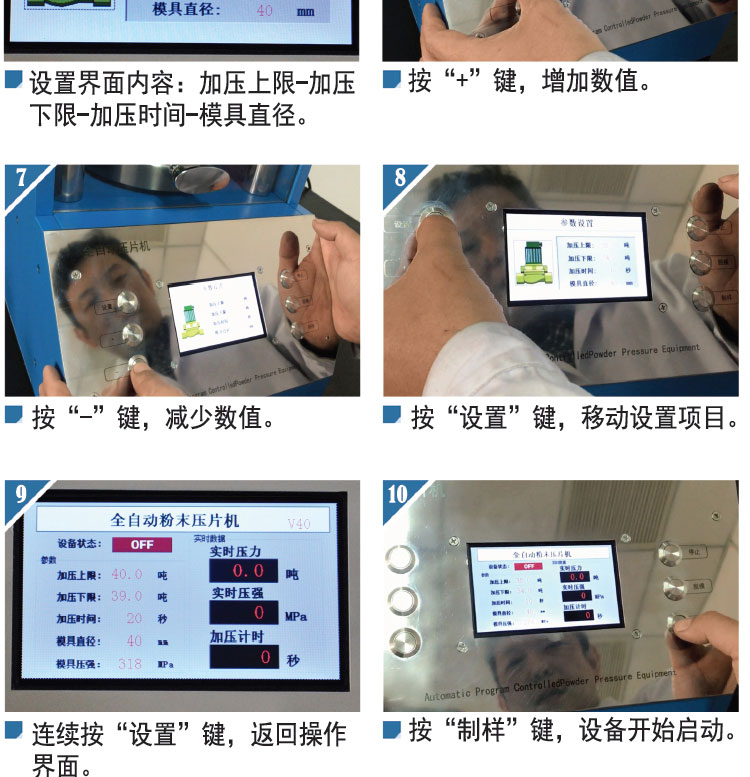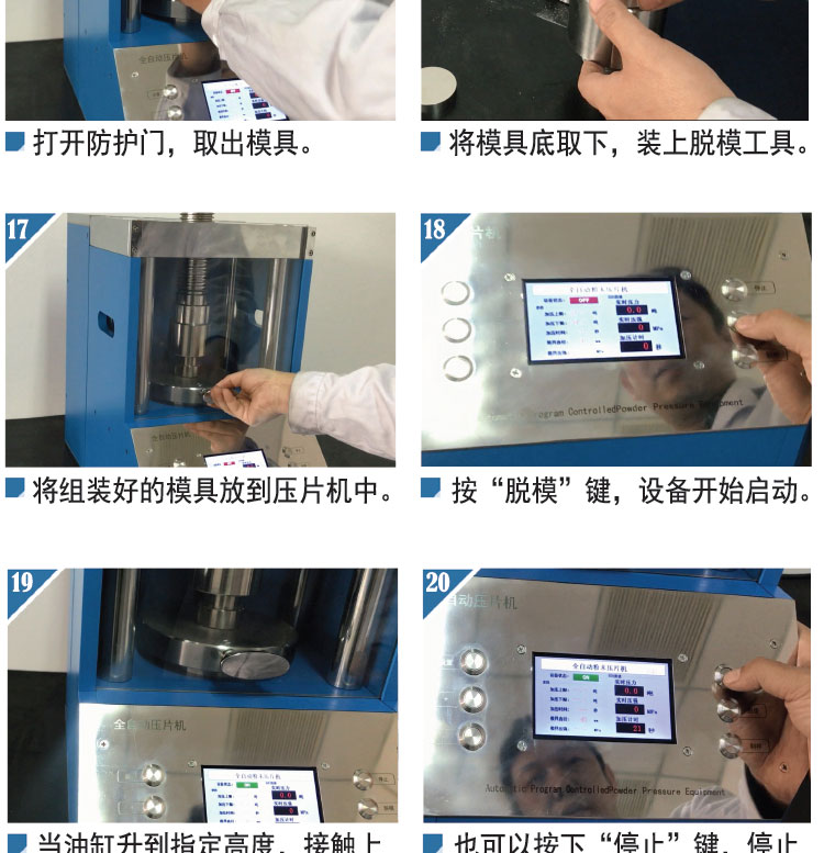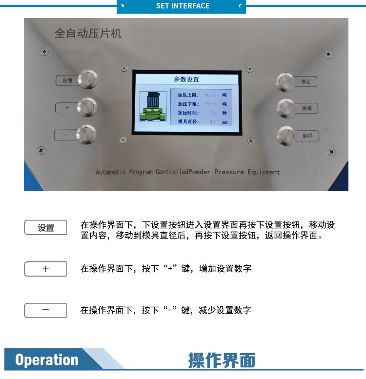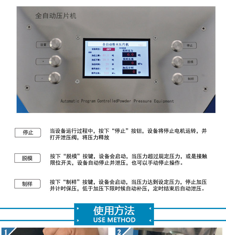 运行过程中按下“停止“按钮,设备将停止点击运转,并打开泄气阀,将压力释放。按下“脱模“按键,设备会启动,当压力超过规定压力,或是接触限位开关,设备会自动停止并泄压。也可以手动停止操作。按下“制样“按键,设备会启动,当压力达到设定压力,停止加压并记时保压,低于加压下*候自己补压,定式结束自动泄压。