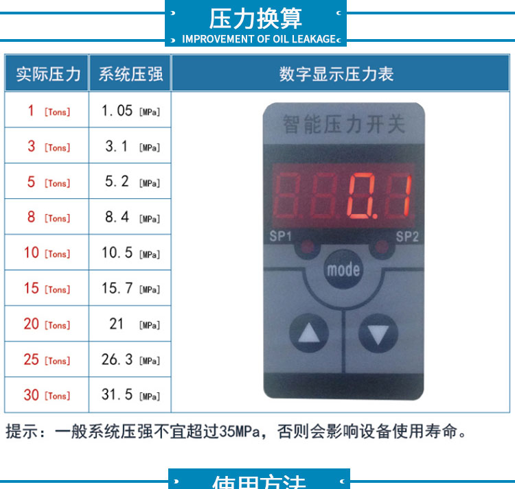 7、新机器或较长一段时间没有使用时,在用之前稍紧放油阀,加压到5-10MPa时即卸荷,连续重复2-3次,即可正常使用。