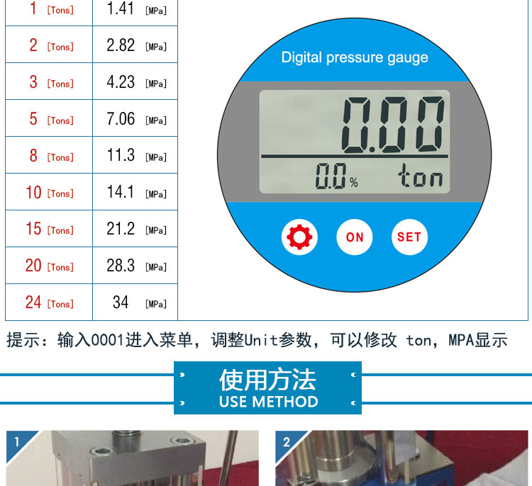 24吨手动数显防护压片机可实现MPa、Psi、KPa等压力单位的切换,适用于安全性要求较高的场所或单位 是针对欧美安全标准设计,符合出口标准。 精度0.01MPa或是5 kg,  压力控制精度高。