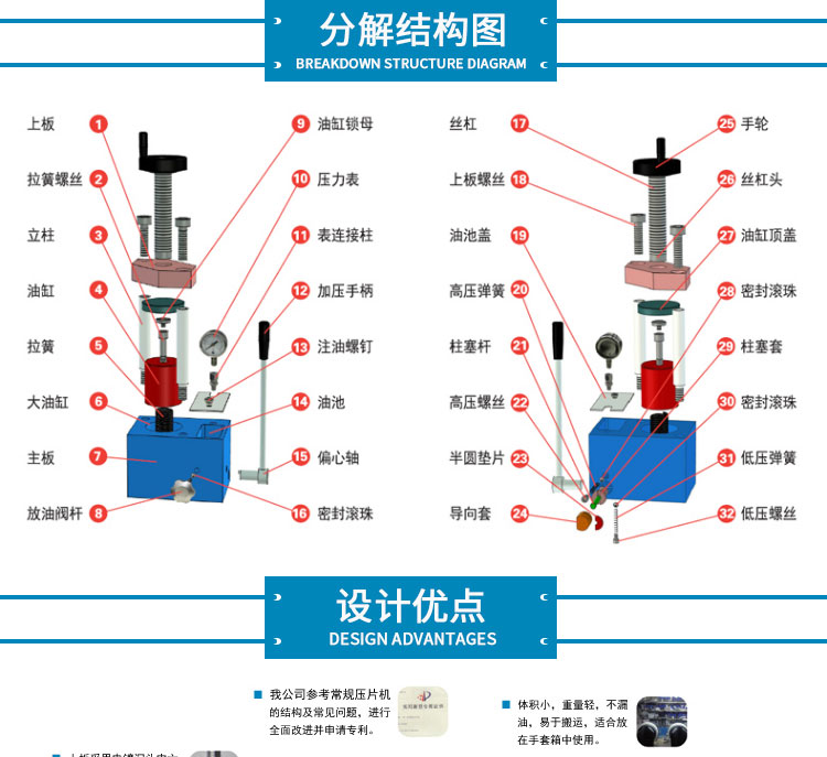 1、上板 2、拉簧螺丝 3、立柱 4、油缸 5、拉簧 6、大油缸 7、主板 8、放油阀杆 9、油缸锁母 10、压力表 11、表连接柱 12、加压手柄 13、注油螺钉 14、油池 15、偏心轴 16、密封滚珠 17、丝杠 18、上板螺丝 19、油池盖 20、高压弹簧 21、柱塞杆 22、高压螺丝 23、半圆垫片 24、导向套 25、手轮 26、丝杠头 27、油缸顶盖 28、密封滚珠 29、柱塞套 30、密封滚珠 31、低压弹簧 32、低压螺丝