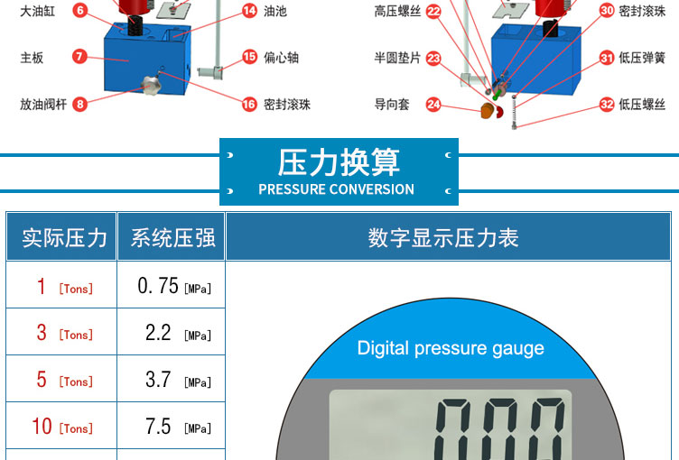 6、加压时感觉手动压把有力,但压力表无指示,应立即卸荷检查压力表;