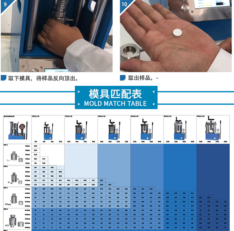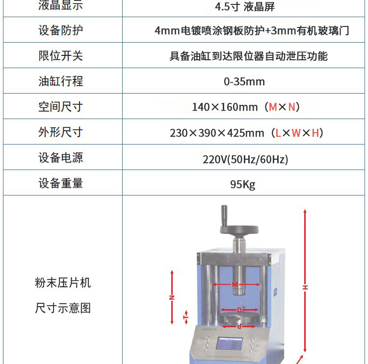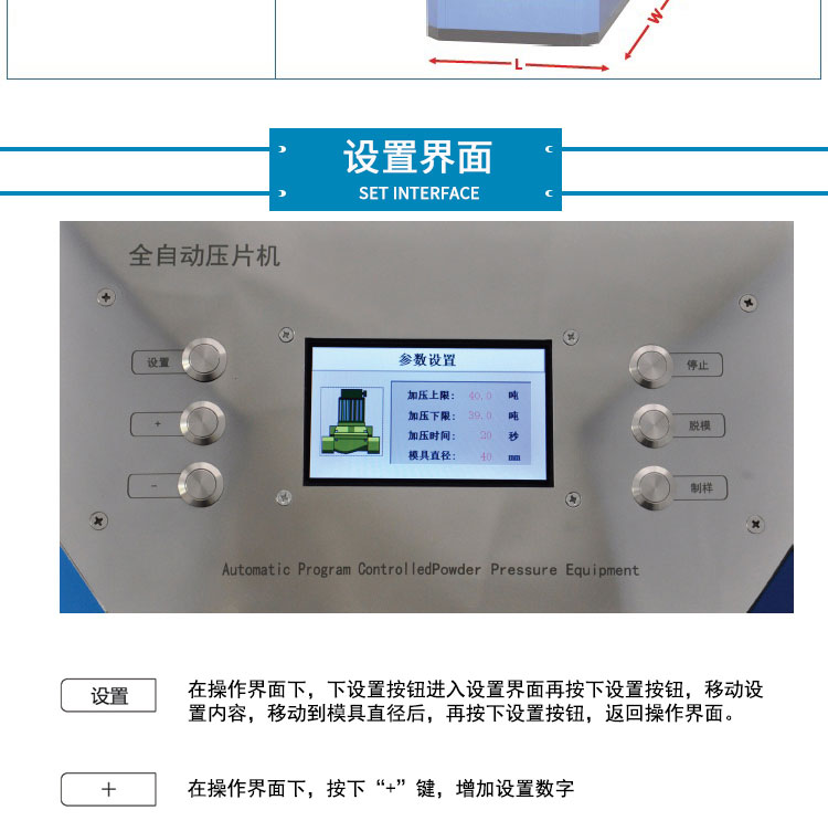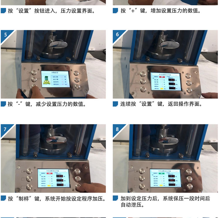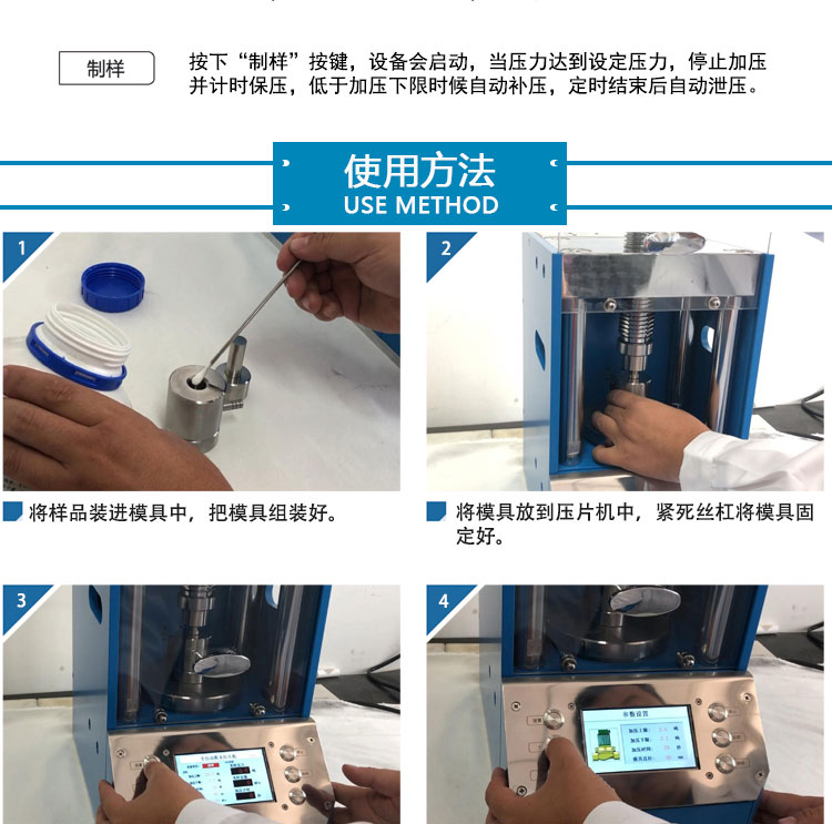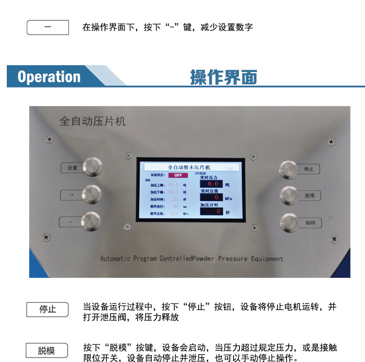 30吨全自动压片机运行过程中按下“停止"按钮,设备将停止点击运转,并打开泄气阀,将压力释放。按下“脱模"按键,设备会启动,当压力超过规定压力,或是接触限位开关,设备会自动停止并泄压。也可以手动停止操作。按下“制样"按键,设备会启动,当压力达到设定压力,停止加压并记时保压,低于加压下*候自己补压,定式结束自动泄压。