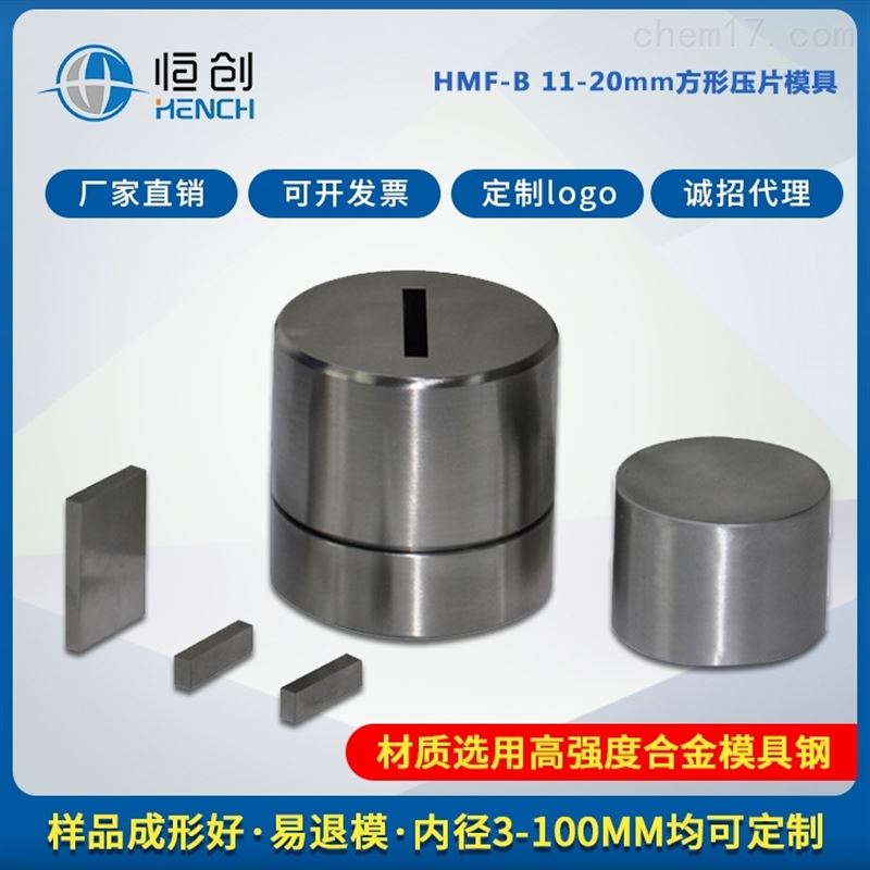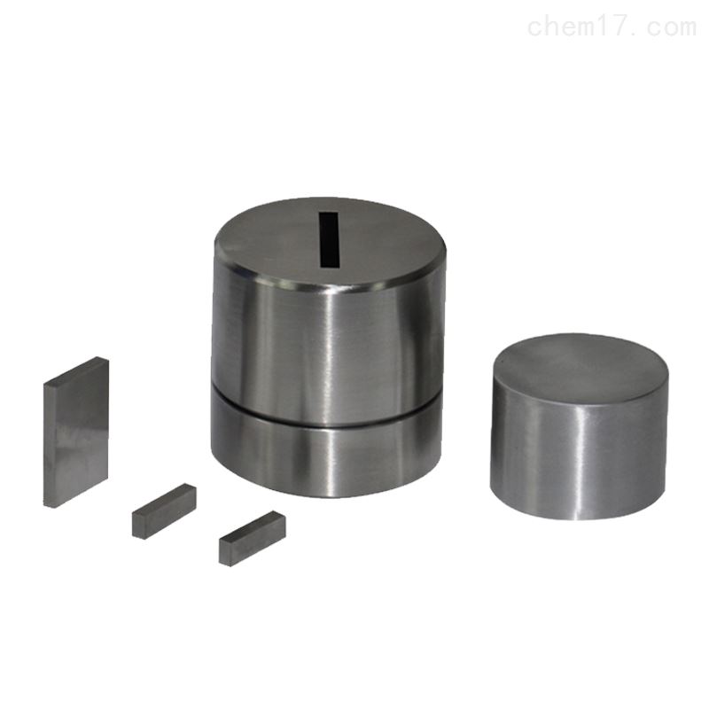 长方形模具适用于一些易成型的细长条样品的压制,压片宽度3-100mm,特殊规格尺寸模具可根据客户要求来定做。模具材质为CR12模具钢,软硬兼适。使用时注意不要超压,否则容易造成压杆变形卡死,导致模具报废。