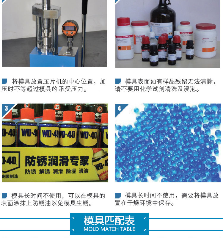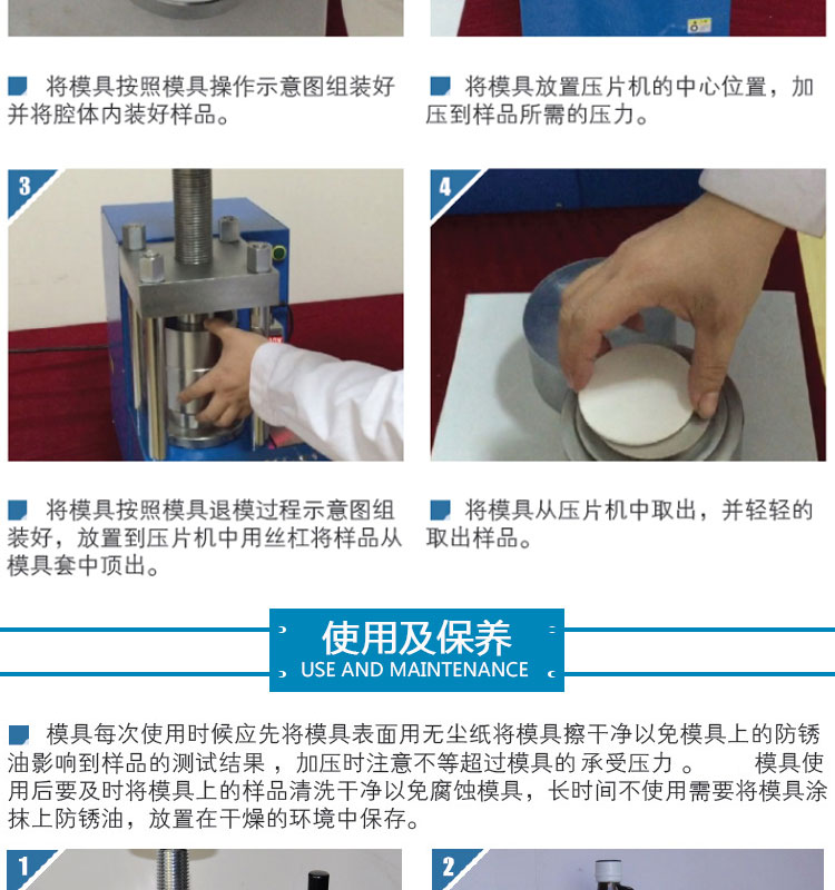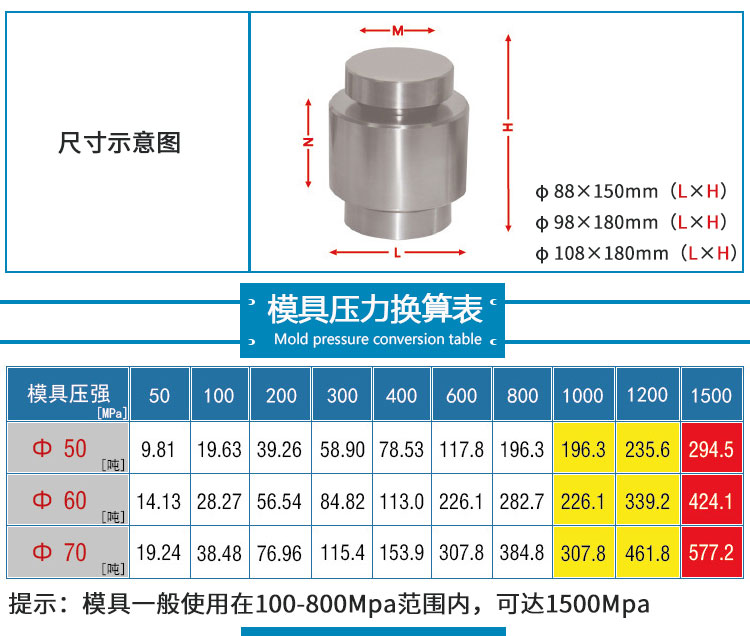 采用日本 高速工具钢 ASSAB+17,材质好,硬度高,不变形,适用于电池、陶瓷、催化、金属、材料、研发制样等行业,规格尺寸:直径3mm~160mm,可根据客户需求定制不同尺寸的压片模具。