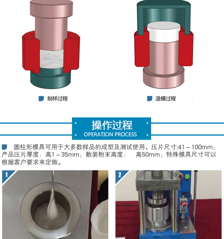 简要描述:41-50mm圆形压片模具采用日本 高速工具钢 ASSAB+17,材质好,硬度高,不变形,适用于电池、陶瓷、催化、金属、材料、研发制样等行业,规格尺寸:直径3mm~160mm,可根据客户需求定制不同尺寸的压片模具