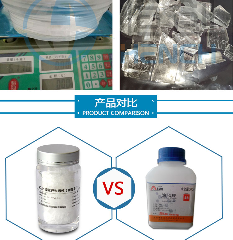 我公司生产的溴化钾(KBr)光谱纯、晶体具有较高的透过率和较宽的投射波段,纯度可达99.99%,HF-A溴化钾光谱纯广泛用于傅里叶变换红外光谱仪,红外分光光度计及红外装置的分光棱镜,透射窗口和透镜等。