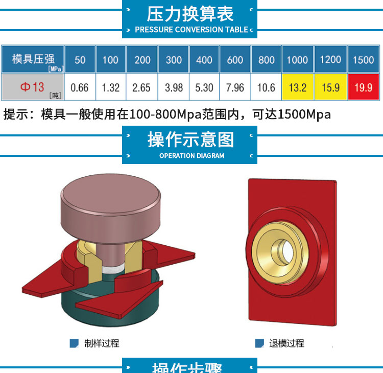 模具材质:日本  高速工具钢ASSAB+17,压头硬度:HRC68-HRC70,样品尺寸:直径:13mm(M)。