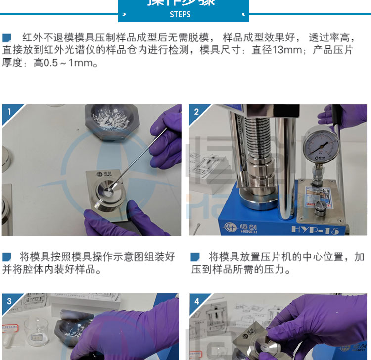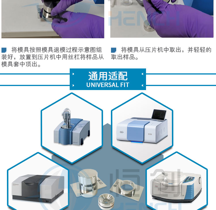 HM-2红外压片模具为傅里叶红外光谱仪固体粉末制样专用模具,材质选用优质合金工具钢。压片成型度好,无需脱模,操作简便。本产品可配套所有品牌傅里叶变换红外光谱仪,例如:北分瑞利,天津港东,美国Thermo,美国PE,德国布鲁克,日本岛津等。
