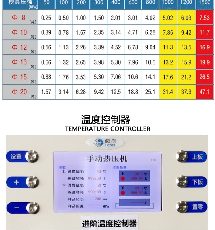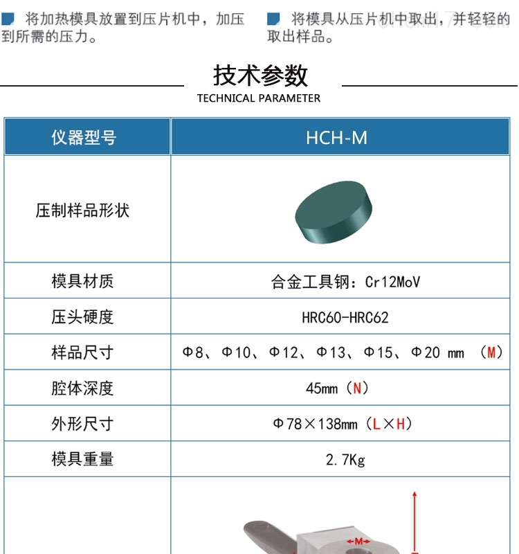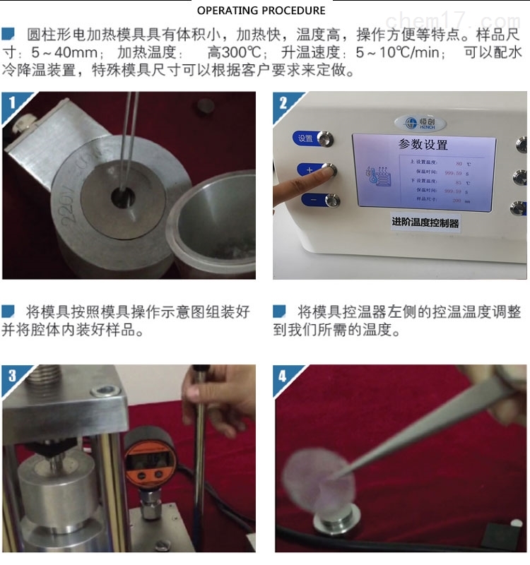 具有体积小,加热快,温度高,操作方便等特点。样品尺寸:5~40mm;加热温度: 300℃;升温速度:5~10℃/min;可以配水冷降温装置,特殊模具尺寸可以根据客户要求来定做。