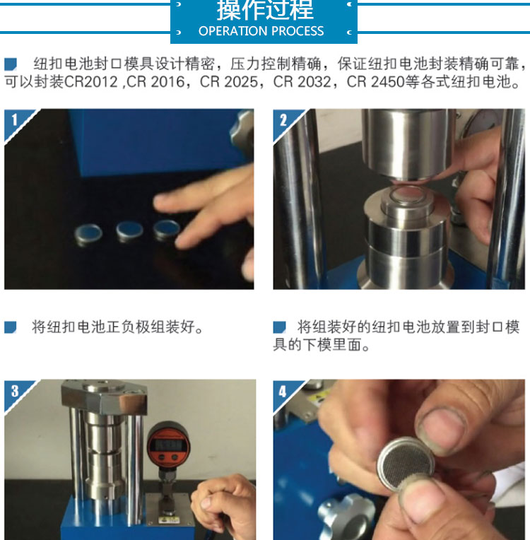 纽扣电池封口模具设计精密,压力控制,保证纽扣电池封装可靠,可以封装CR2012,CR2016,CR2025,CR2032,CR2450等各式纽扣电池。适用于各大高校及企业。