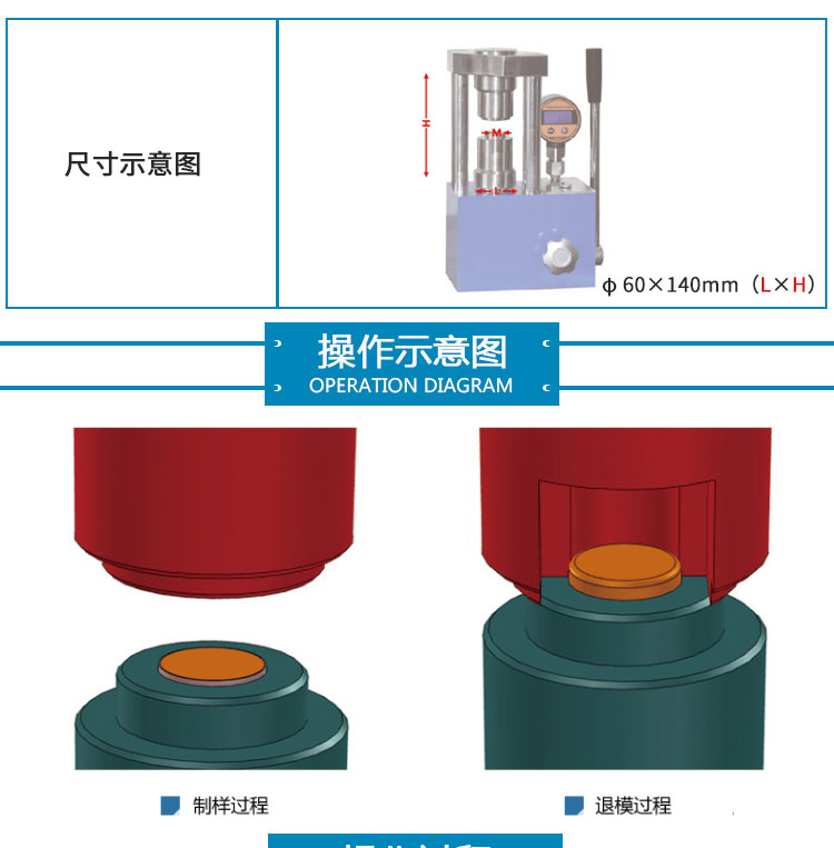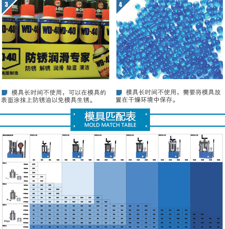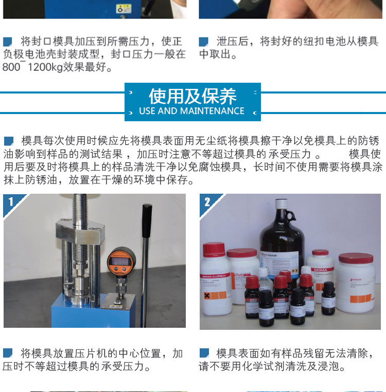模具每次使用时候应先将模具表面用无尘纸将模具擦干净以免模具上的防锈油影响到样品的测试结果,加压时注意不等超过模具的最大承受压力。模具使用后要及时将模具上的样品清洗干净以免腐蚀模具,长时间不使用需要将模具涂抹上防锈油,放置在干燥的环境中保存。
