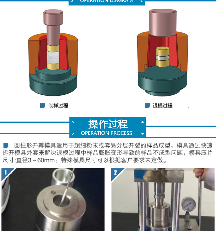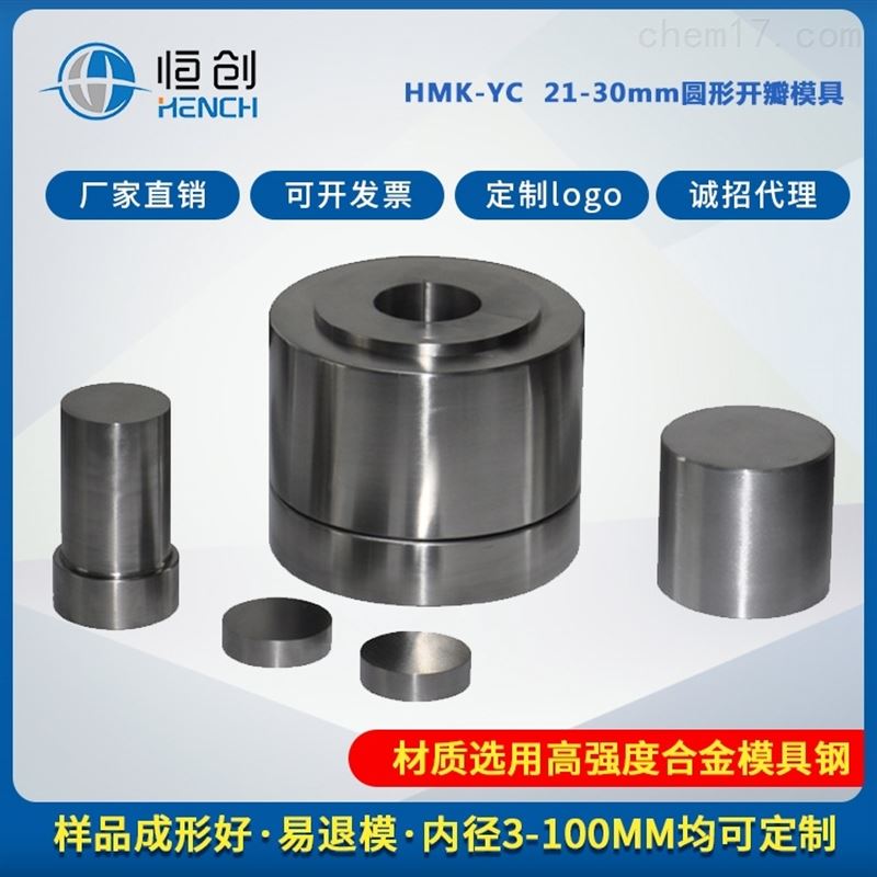 21~30mm圆形开瓣模具广泛用于大多数样品的成型及测试使用,适用于电池、陶瓷、催化、金属、材料、研发制样等行业。 产品介绍如下: