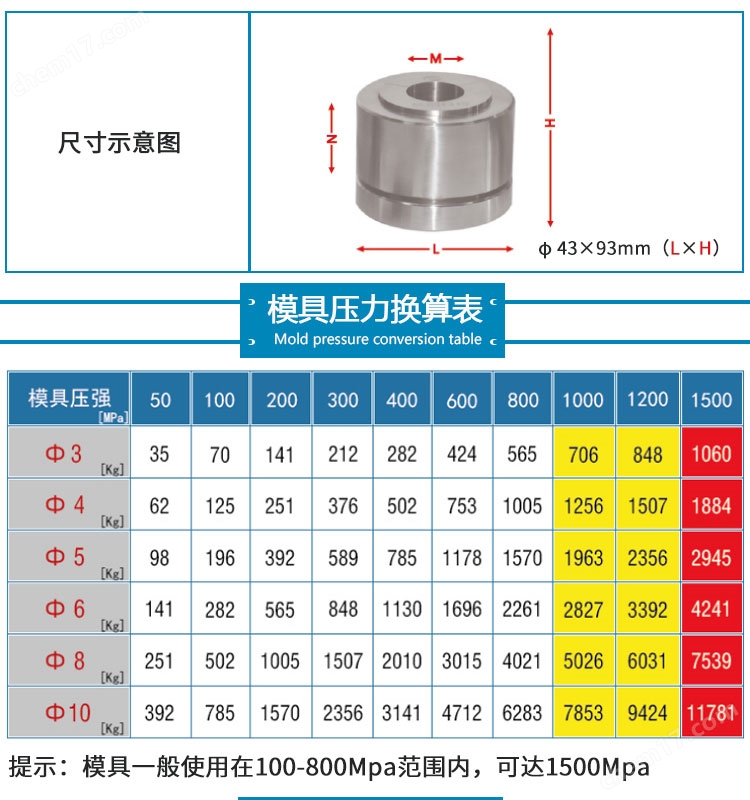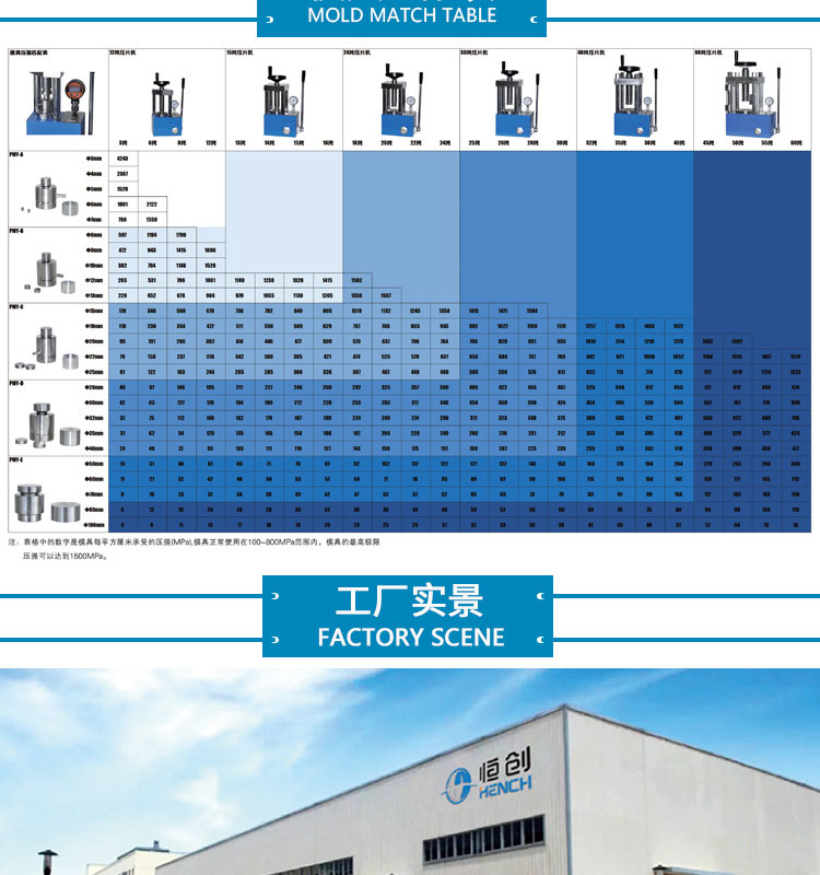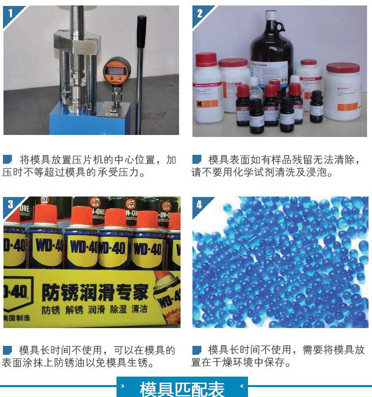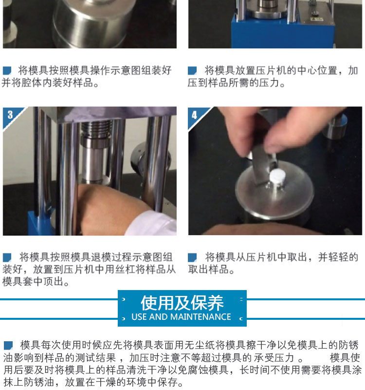 我公司配套压片模具种类规格齐全。包含普通圆柱模具、圆柱形开瓣模具、长方形模具、长方形开瓣模具、红外专用模具、X荧光专用硼酸模具、X荧光专用铁环模具、X荧光专用钢环模具、球形模具、环形模具等压样模具。特殊形状、特殊规格、特殊尺寸的模具可定做。