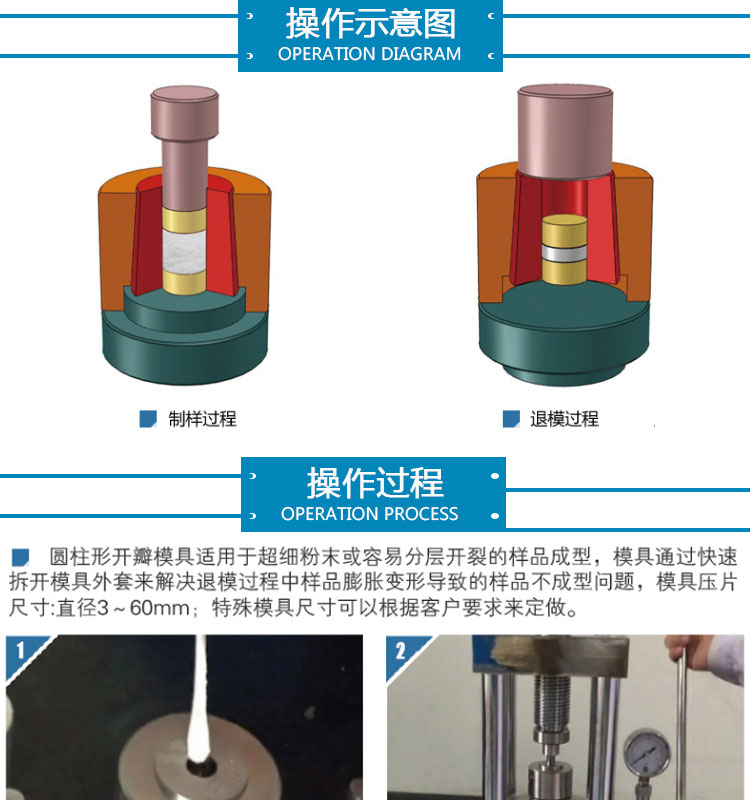 3.长方形开瓣模具针对一些细长条、圆形开瓣模具针对一些圆柱形样品或是一些不易成型的样品。
