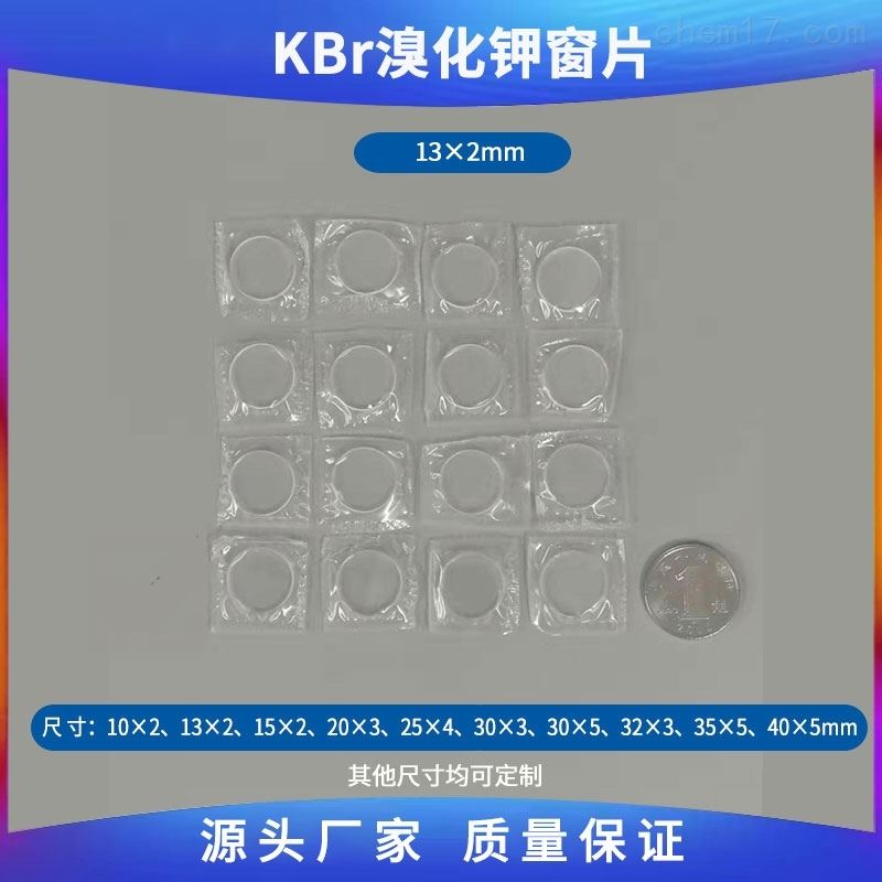 规格(mm):13*2mm,20*3mm,25*4mm,32*3mm,30*5mm,40*3mm,40*5mm。可根据客户需求定制不同规格的溴化钾窗片