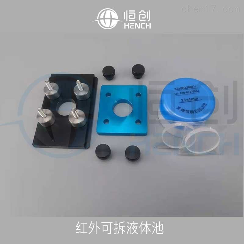 红外可拆液体池傅里叶变换红外光谱仪、红外分光光度计专用附件,该液体池采用KBr做窗片,透射范围2.5m-25mm,可进行0.1mm、0.2mm、0.3mm、0.5mm几种液体厚度的红外测量。