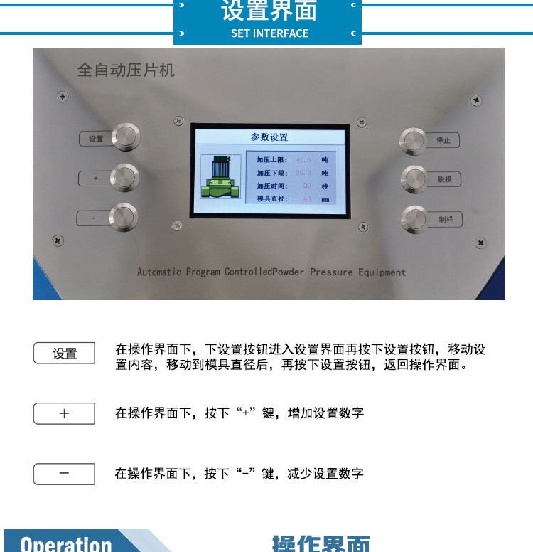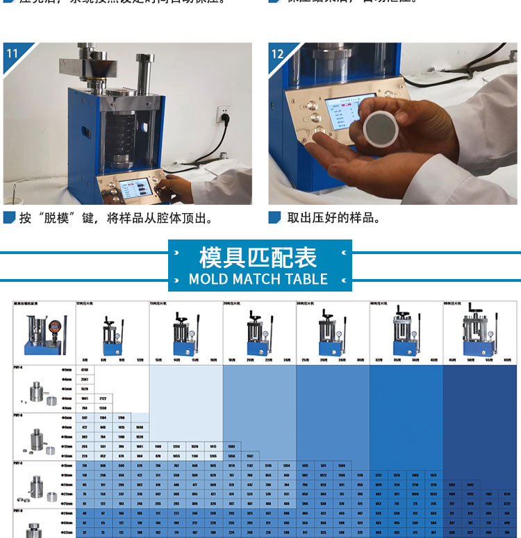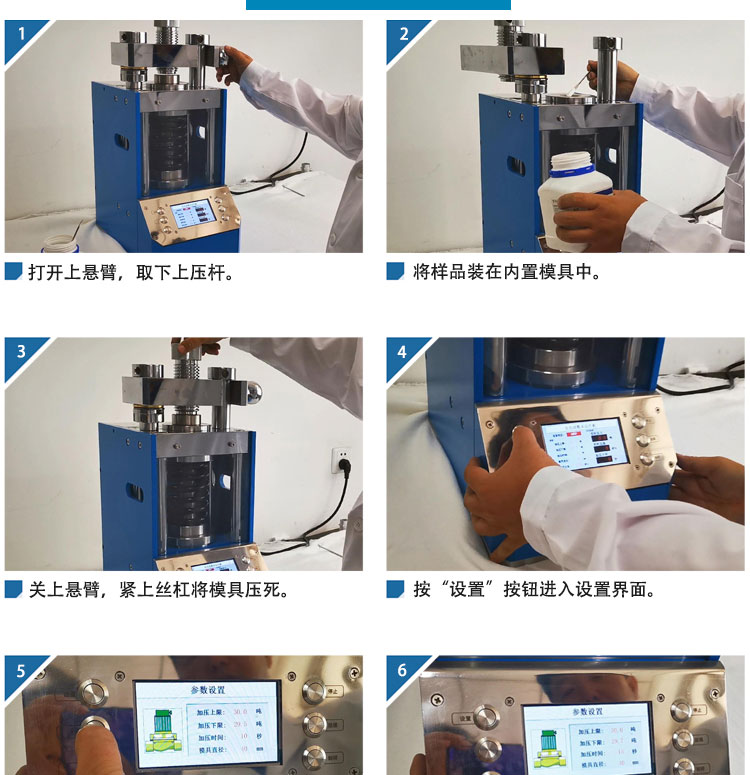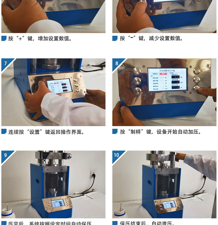 程序加压 - 程序保压 - 程序泄压 - 程序退样。适用于矿山粉末压片、材料科学研究、荧光光谱仪前处理制样等行业。