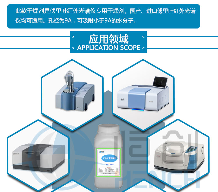 此款干燥剂吸附水分子效率高,烘干后可循环使用。本产品可配套所有品牌傅里叶变换红外光谱仪,例如:北分瑞利,天津港东,美国Thermo,美国PE,德国布鲁克,日本岛津等。
