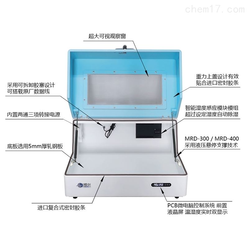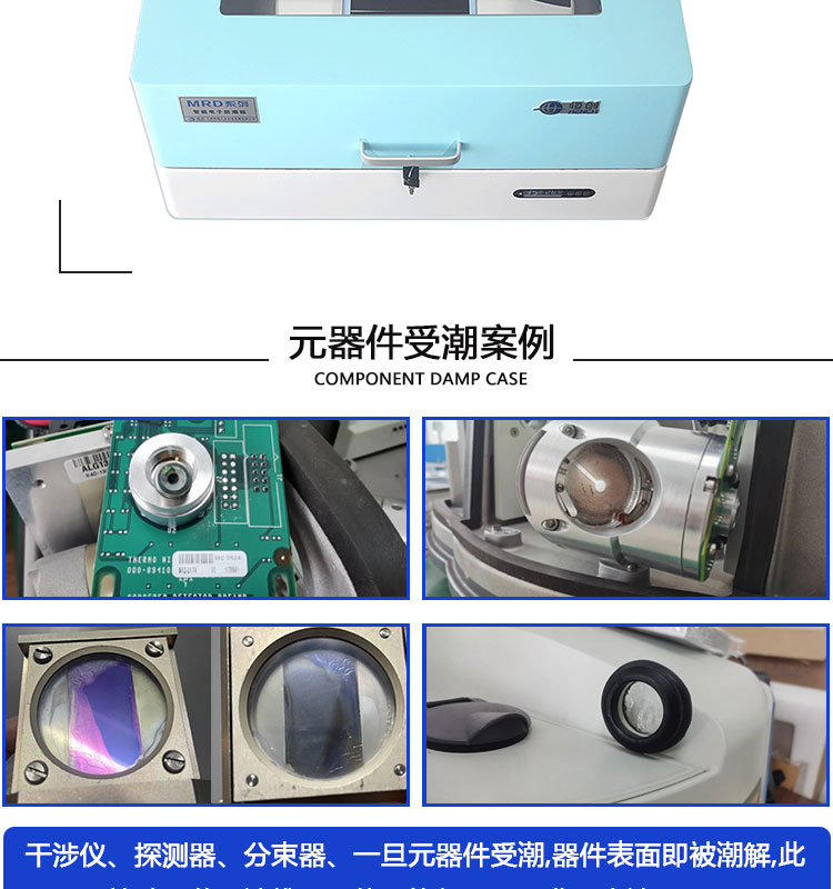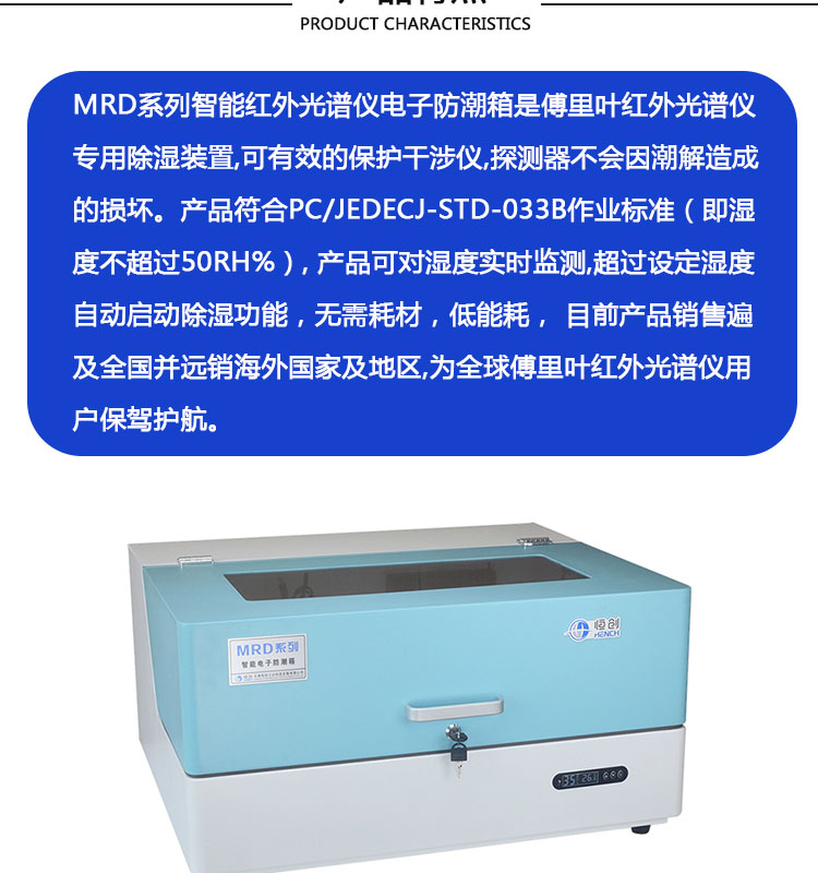 MRD系列智能红外光谱仪电子防潮箱是傅里叶红外光谱仪专用除湿装置可有效的保护干涉仪,探测器因潮解造成的损坏。产品符合PC/JEDECJ-STD-033B作业标准(即湿度不超过50RH%)产品可对湿度实时监测,超过设定湿度自动启动除湿功能,无需耗材,低能耗, 目前产品销售遍及全国并远销海外,为全球傅里叶红外光谱仪用户保驾护航。