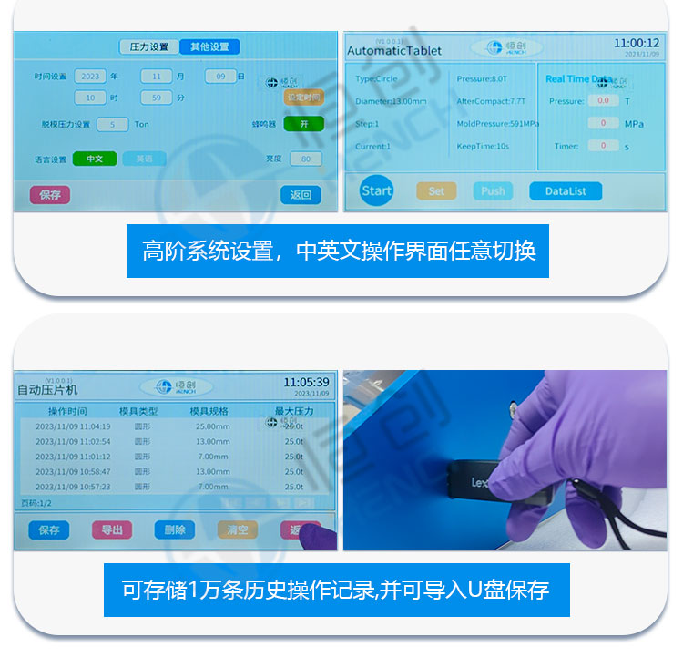 数据管理 可存储1万条历史操作记录,并可导出U盘
